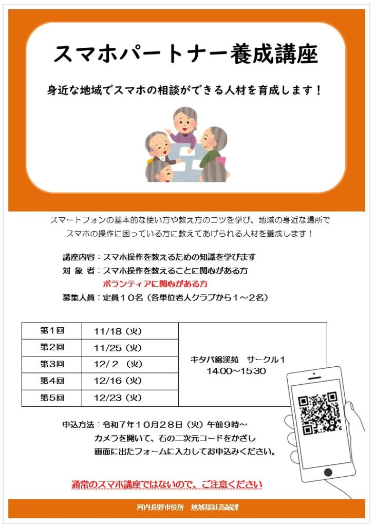 2025年12月26日 / 最終更新日時 : 2025年12月26日 senoo お知らせ 河内長野市スマホパートナー養成講座 12/23(火)河内長野スマホパートナー養成講座の全5回の最終回です。2人1組になって、相談会のシミュレーションを行いました。 FacebooktwitterPocketCopy